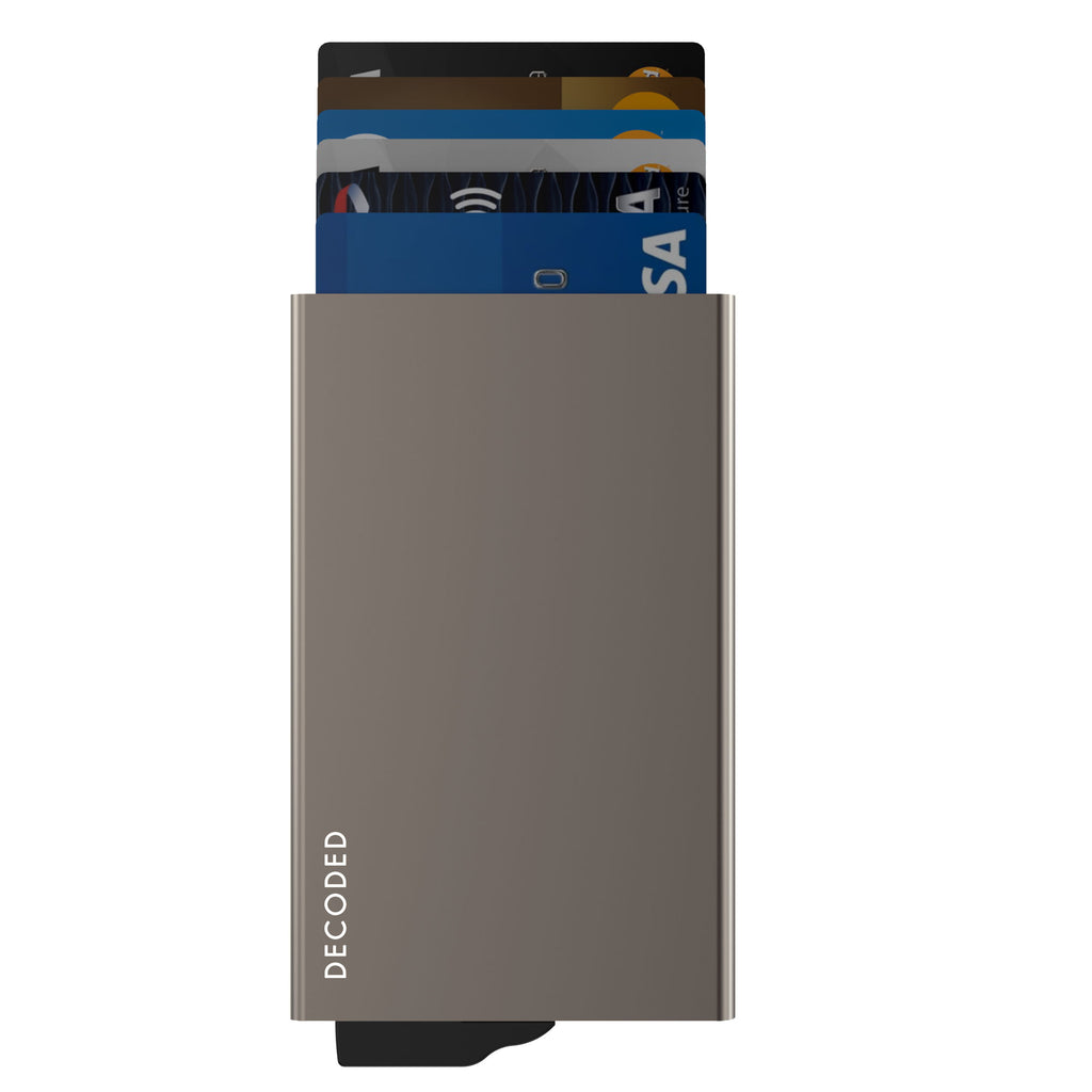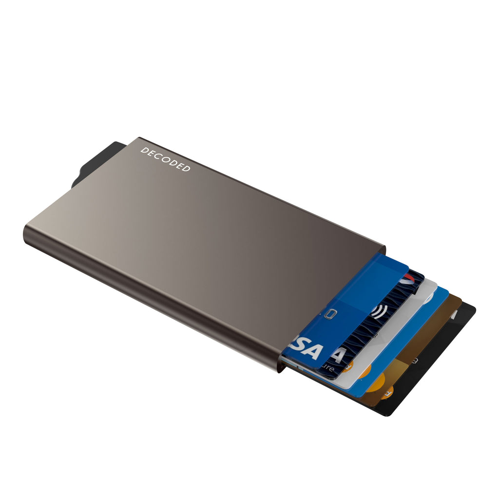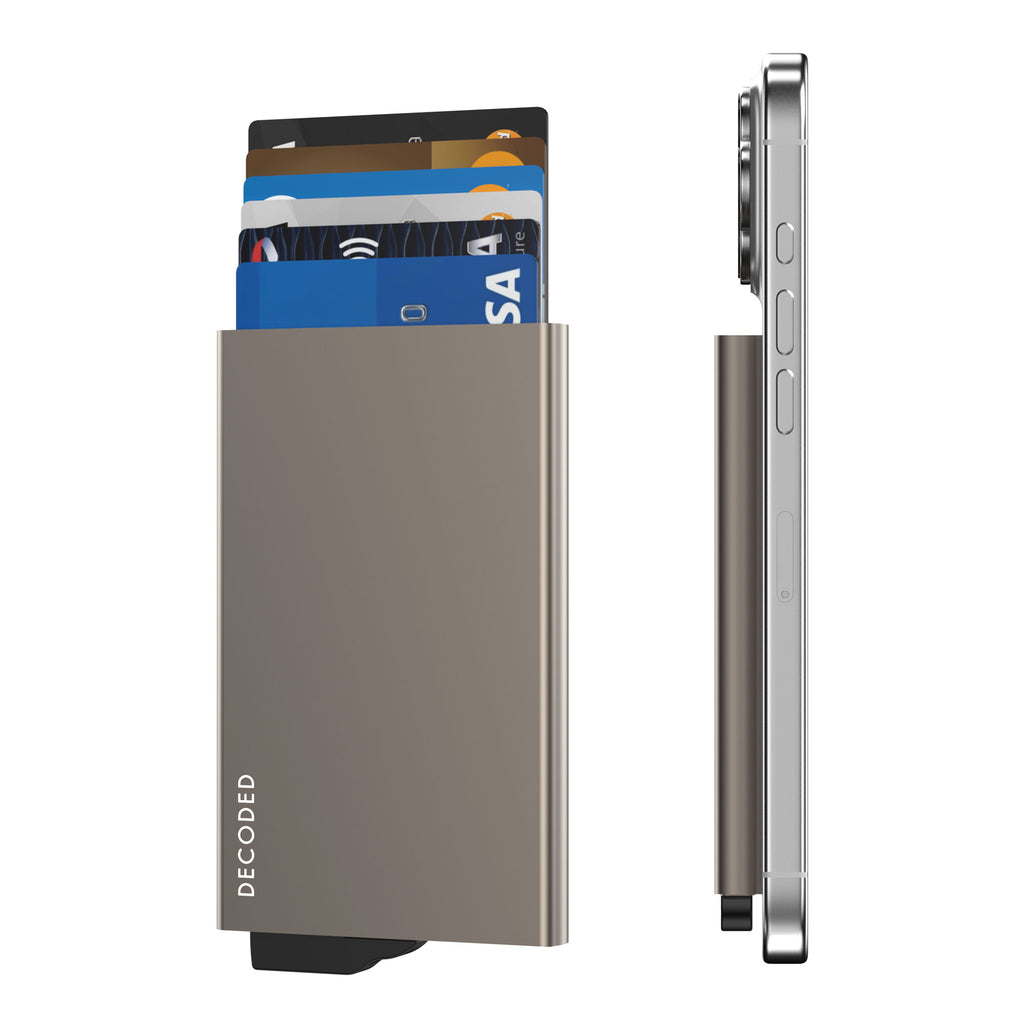 Despite its ultra-slim design, the Decoded Cardholder holds up to 4 embossed or 6 flat cards without adding unnecessary bulk. Built with RFID and NFC blocking technology, it safeguards your cards from wireless data theft while maintaining a sleek, pocket-friendly profile. Your cards are further protected from bending, breaking, and daily wear thanks to its rigid aluminum casing.